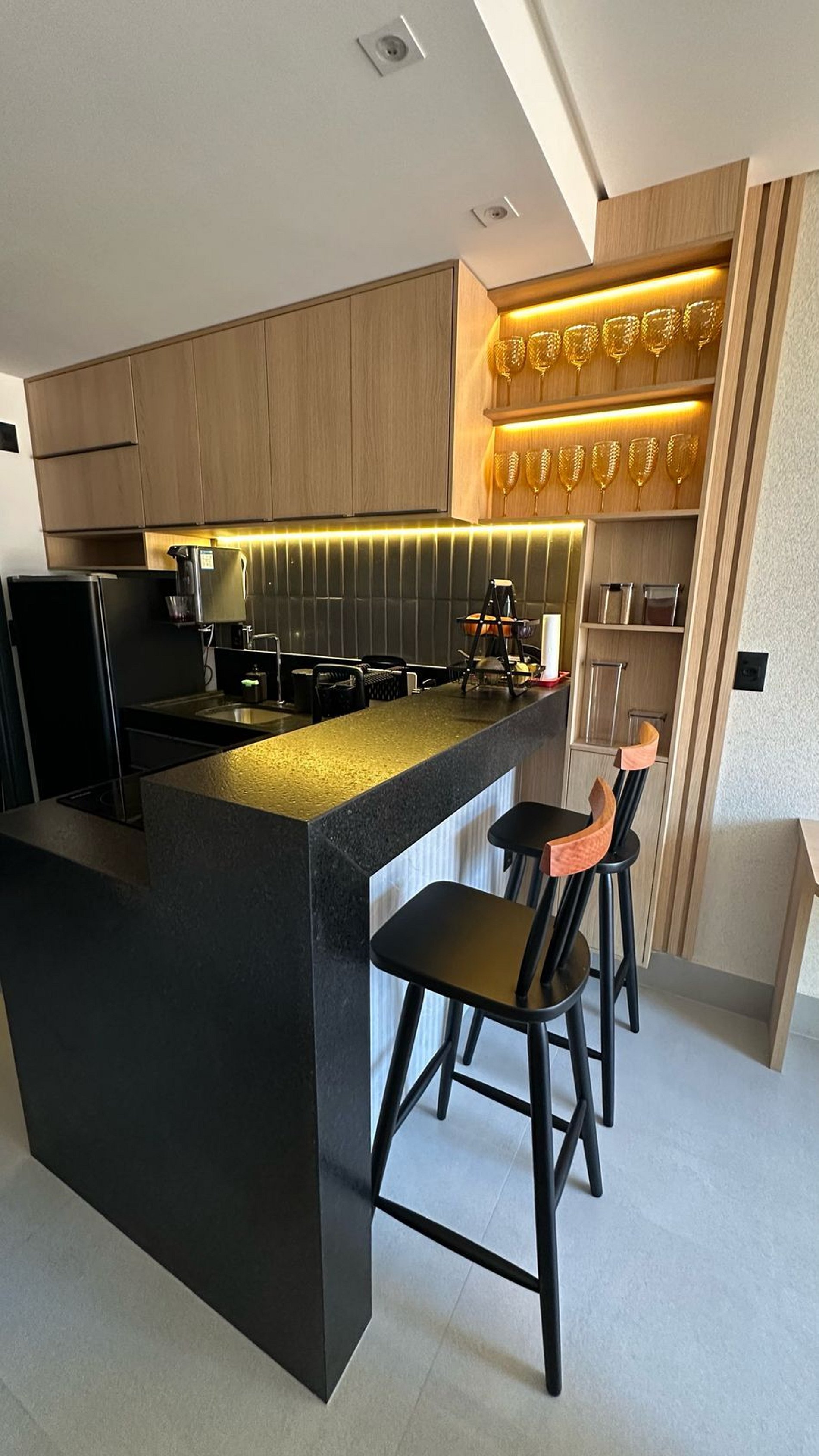 • Cozinha compacta e equipada: Projetada com os itens essenciais para preparar refeições práticas com autonomia e comodidade.