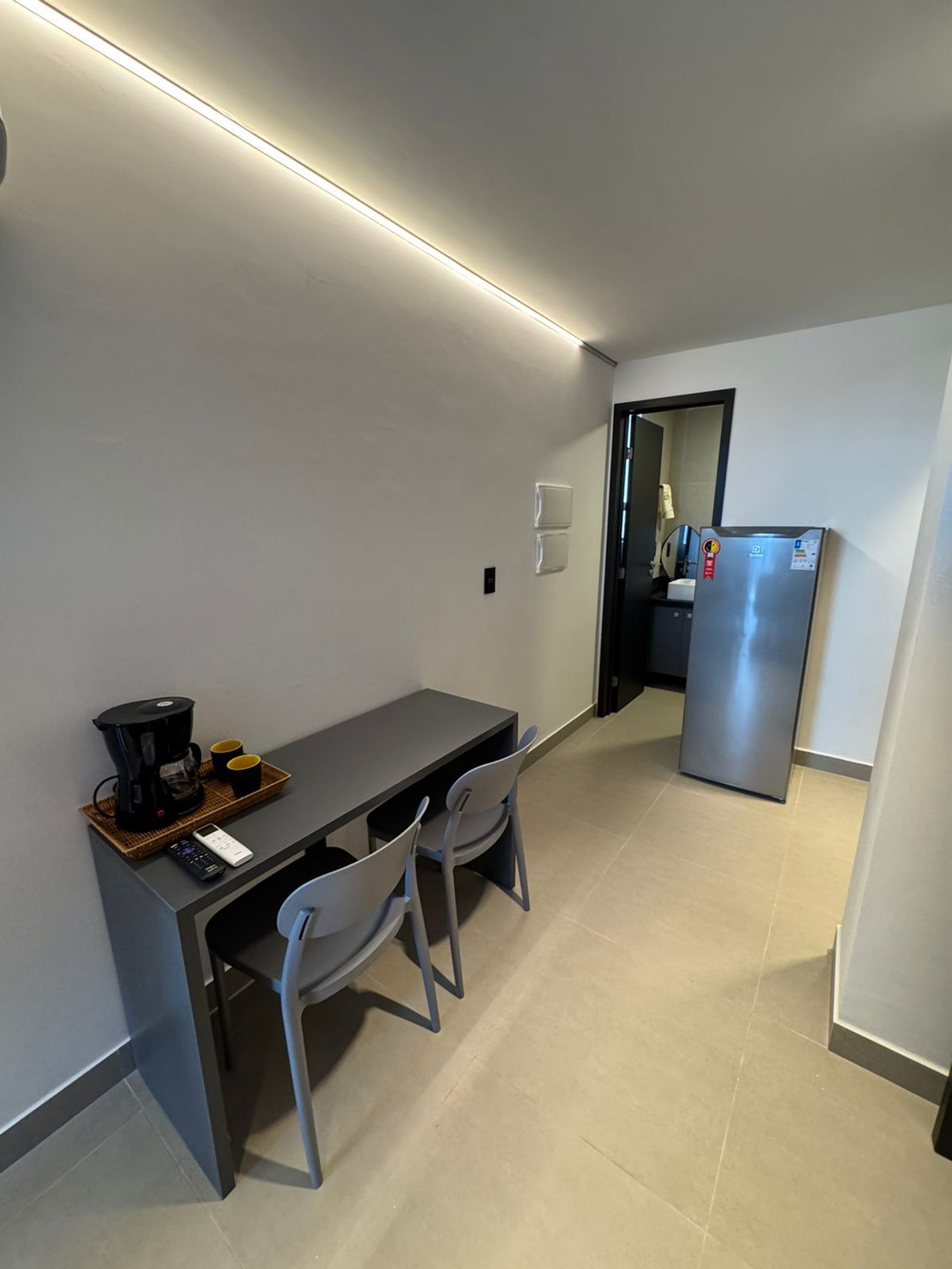 A cozinha, embora compacta, está equipada com utensílios essenciais, incluindo micro-ondas e diversos utensílios de cozinha, permitindo preparar refeições rápidas e práticas. O apartamento dispõe ainda de ar condicionado para garantir o máximo conforto, especialmente nos dias mais quentes.