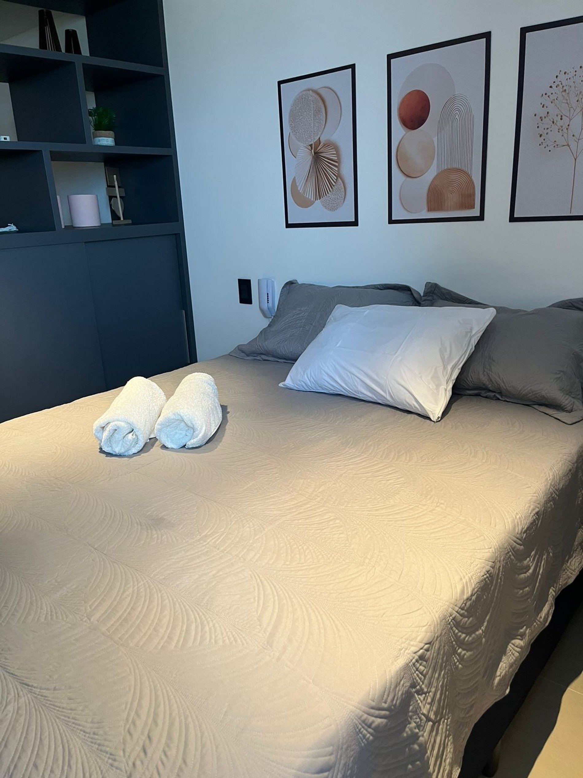 O espaço conta com um quarto elegante equipado com uma cama de casal queen size.